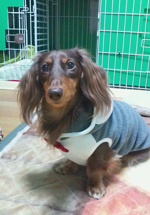いつも お出かけ写真ですが…たまには おうちで!と 可愛いペンギンパーカー着せたのに〜(--;)