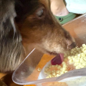 昔の名残りでフードがあることがわかると伏せをして待機。そして短い脚で、お手おかわり。