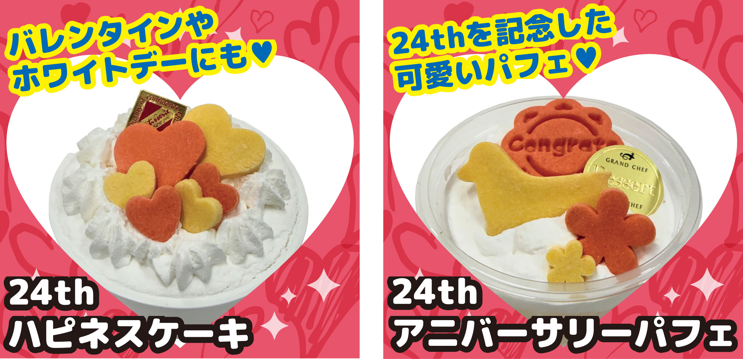 | 内容量 | 24thハピネスケーキ:約110g 24thアニバーサリーパフェ:約85g |